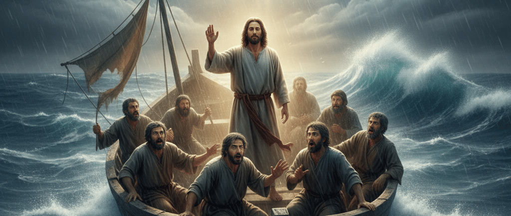 Jesus descansava no barco. Jesus dormia (Marcos 4:38). Veio uma forte tempestade que agitou violentamente o barco e deixou os discípulos amedrontados. Eles logo acordaram Jesus aos gritos e clamando – “Mestre, não te importas que morramos!”.